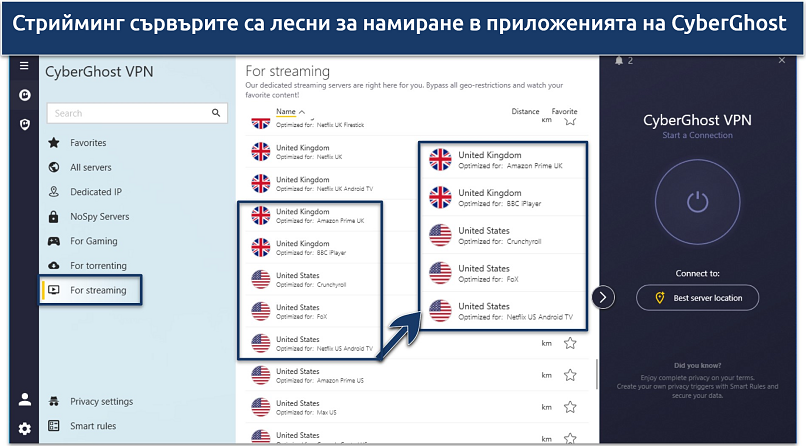 Една от любимите ми VPN услуги за стрийминг, CyberGhost има специализирани за стрийминг сървъри, които са предназначени за достъп до редица международни платформи. Всеки от тях е етикетиран според платформата, с която работи най-добре, което улеснява намирането на сървъра, от който се нуждаете. Те също са оптимизирани за плавен стрийминг, което ви позволява да гледате предавания и филми в HD без прекъсвания. Използвам и тествам сървъра на Netflix от почти 3 години и никога не съм имала бавна или накъсана връзка. Оптимизираните за стрийминг сървъри на CyberGhost работят последователно също и с техните целеви платформи. Това включва Disney+, BBC iPlayer, Amazon Prime Video и много други.