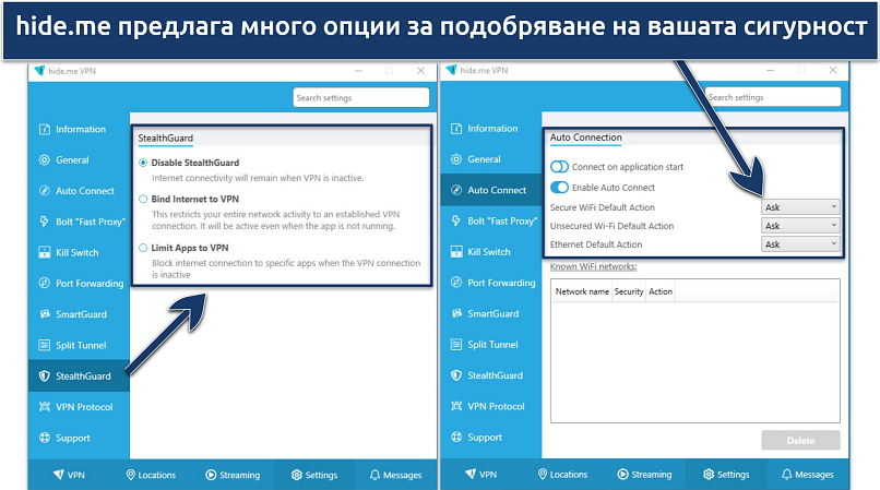 Можете също така да персонализирате реакцията на hide.me към защитени, незащитени и етернет връзки. Когато открие една от тези мрежи, можете да настроите да ви пита дали искате да се свържете, да активирате или деактивирате VPN, или пък да игнорирате мрежата.