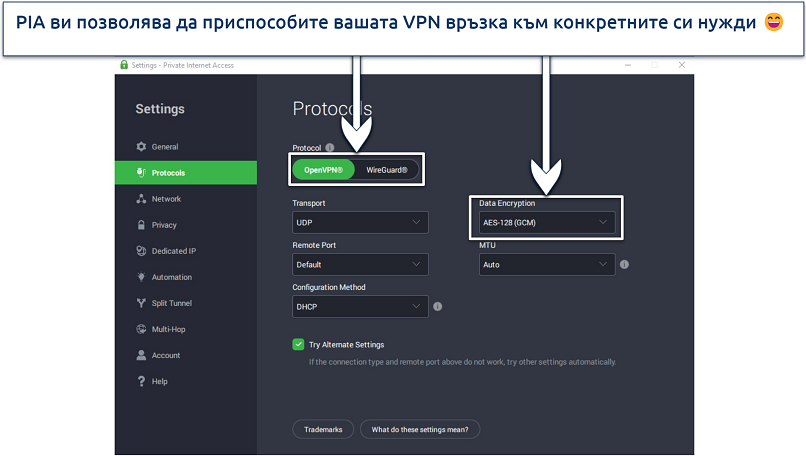 3. Private Internet Access — Персонализируемите настройки на приложението ви позволяват да балансирате между скорост и сигурност
