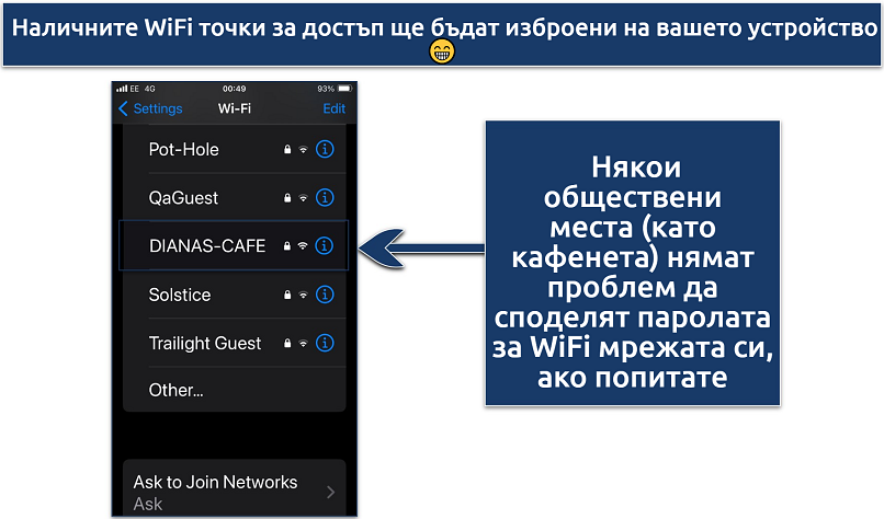 - Използвайте публична WiFi мрежа — предимно безплатна за ползване, но прави връзката ви уязвима