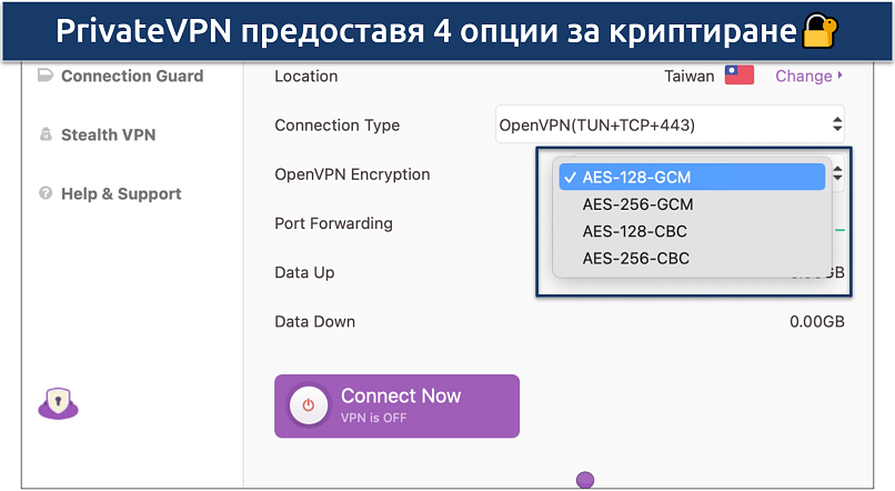 PrivateVPN улеснява постигането на правилния баланс между сигурност и скорост в Китай. Можете да регулирате нивата на криптиране от AES 256-битово до 128-битово и да конфигурирате връзката да използва порт 443, което помага за поддържане на сигурен достъп дори при строги ограничения. Тествахме криптирането на PrivateVPN на 128-бита, което доведе до прилично подобрение на скоростта. Имате и опции за протоколи — L2TP, например, е по-надежден от OpenVPN в силно рестриктивни мрежи.