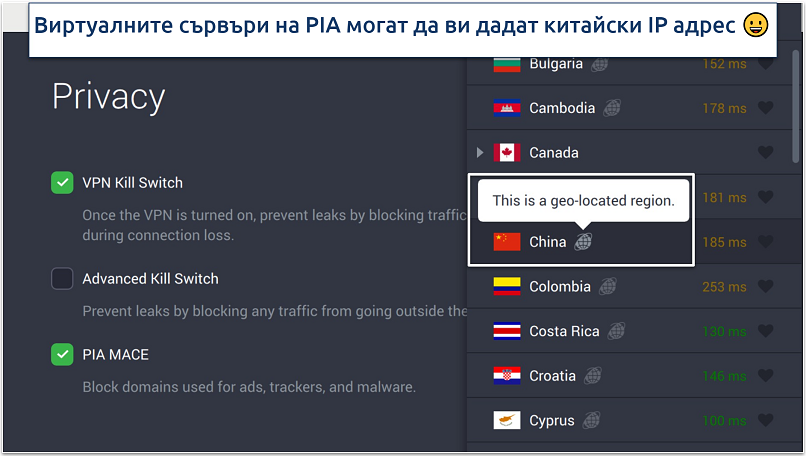 Да, PIA е една от малкото VPN услуги с китайски IP адреси. Наличието на физически сървъри в страната може да доведе до рискове за поверителността, тъй като местните разпоредби може да изискват наблюдение на данните. Сървърите, предоставяни от такава VPN мрежа обаче са виртуални (разположени извън Китай) и въпреки това могат да ви предоставят надежден китайски IP адрес.