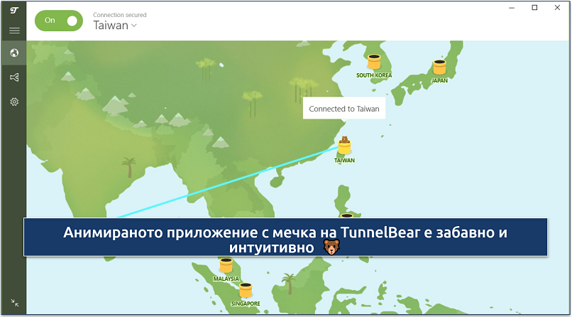 Опростеният интерфейс на TunnelBear я прави една от най-лесните за ползване VPN услуги в Китай. Изборът на сървър, базиран на карта, е интуитивен — просто изберете сървър и анимирана мечка ще си проправи път от вашето местоположение до крайната цел. Тъй като Китай е голяма страна, визуалната карта улеснява бързото идентифициране и свързването с най-близкия сървър.